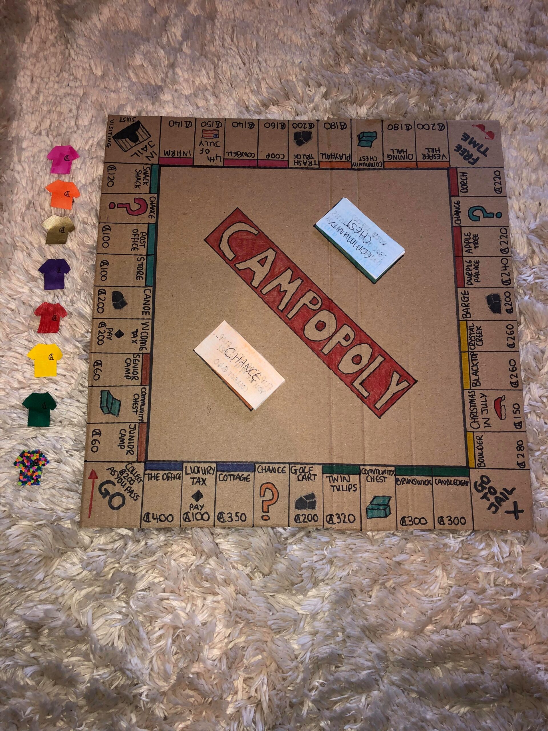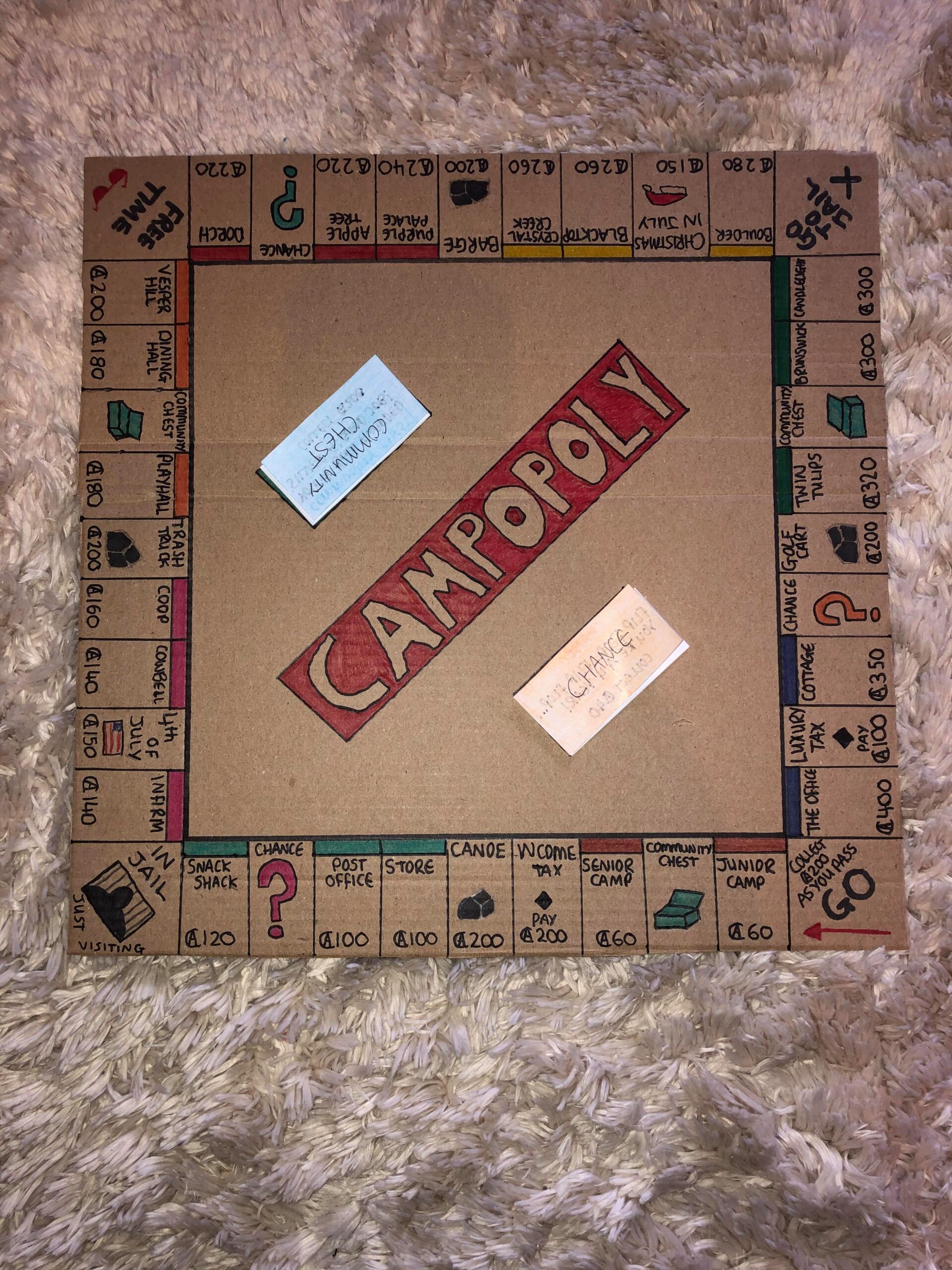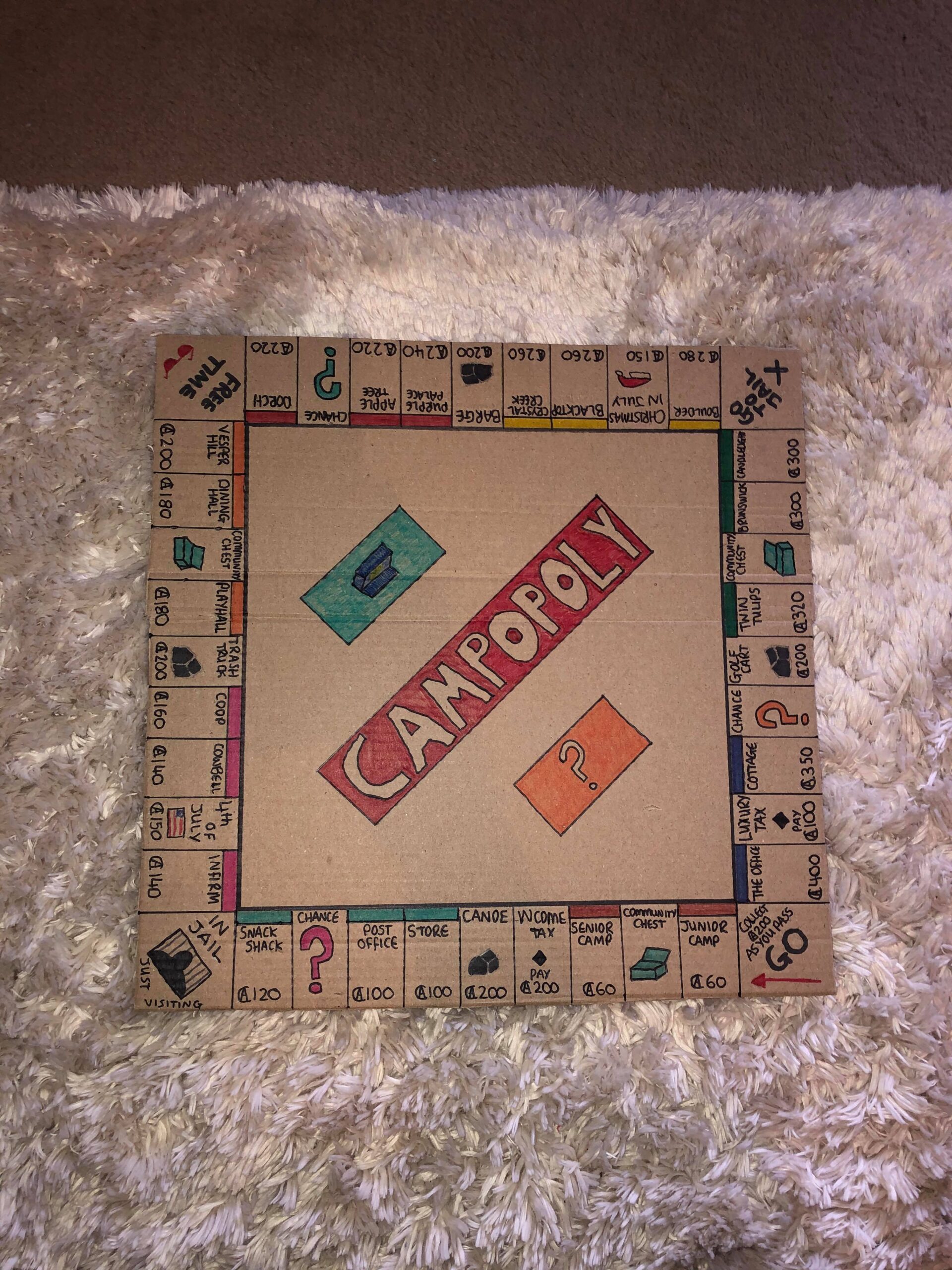 And Carson didn’t stop there. She also created a Monopoly game with a whole side of it dedicated to Camp. I love that the memories of camp, the inspiration of camp, the culture of camp, our values, traditions, goofy little rituals and timeless in-jokes have been immortalized in a board game.