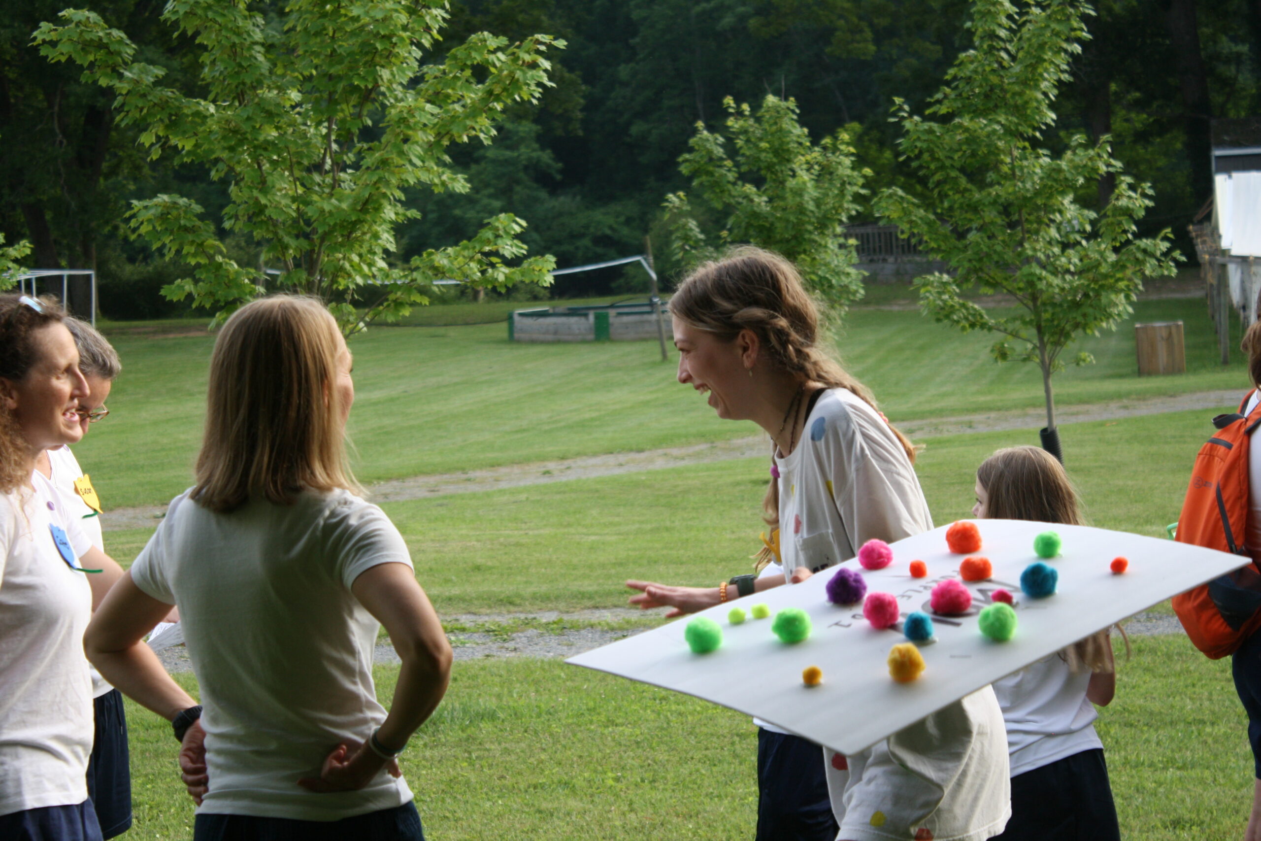 Throughout the weekend our girls were introduced to many ‘Ghany traditions, including the colors that help identify different groups in camp. The Junior Counselors are purple, the Mini Campers are tie-dye, Midways are teal, Start-Ups are yellow, (and there are more color groups)… and the biggest rivalry in camp is between the Blue and Gray teams. Every Term Camper ends up being either a Blue or a Gray. The pom pom poster was the perfect way to describe our MDW color.